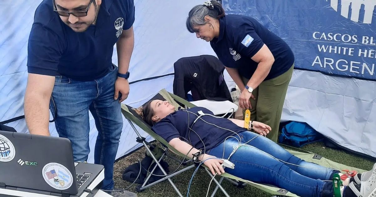 Personal de Cascos Blancos usando el Centro de Diagnóstico Móvil EXO.